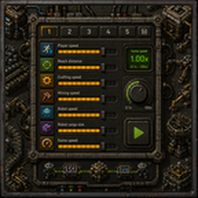 GUI with sliders to tweak player bonuses (move speed, reach, craft speed, mining speed), robot bonuses (speed, cargo), game speed (0.1x-100x), and robot energy consumption. 5 saveable profiles. No research needed!