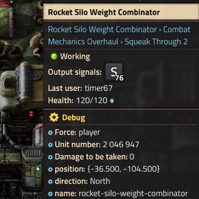 Combinator that outputs rocket payload fullness (0-100%) as virtual signal S when wired to a single rocket silo. Unlocked by Circuit Network.