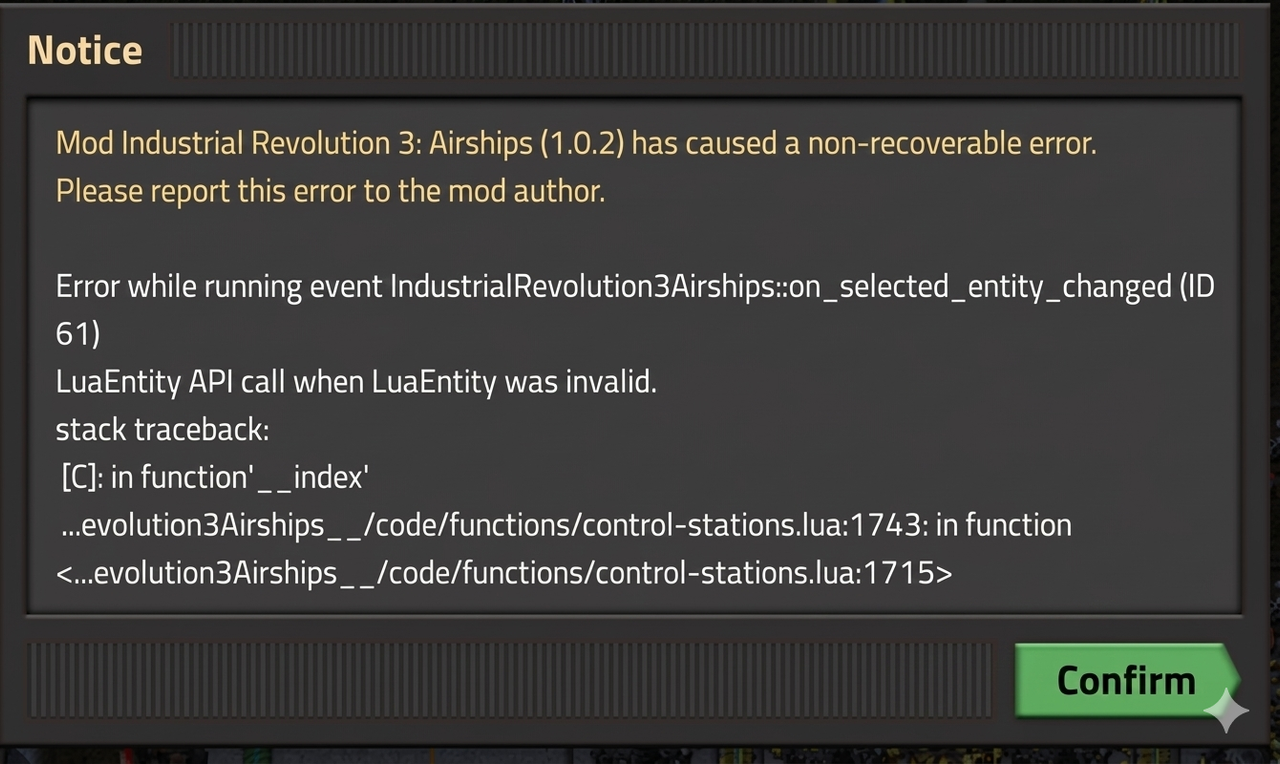 Thank you for the patch! If the issue only occurs on old maps, I’ll start my 2.0 run with peace of mind xD. I'm glad I won't have to remove the Airships addon, as they are excellent for logistics before getting construction bots.