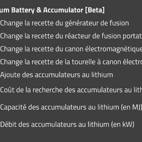 Add lithium battery to Aquilo. With it you can craft a new accumulator and a new tier of equipments. They are also used in some Aquilo recipe, like the science pack. Compatible with Better Aquilo mod.