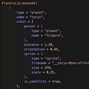PlanetsLib:extend(configs)— Throws an error if passeddistanceororientation. (as these will be generated automatically on the prototype.) Instead, it takes the following fields:orbit— Object containing orbital parameters:parent— Object containingnameandtypefields, corresponding to a parent atdata.raw[type][name]. Planets in the original solar system should have an orbit withtype = "space-location"andname = "star".distance— Number — orbital distance from parentorientation— Number — orbital angle from parent (0-1). Note that orientation is absolute, not relative to the parent's orientation.sprite— Object (optional) — Sprite for the planet’s orbit. This will be centered on the parent's location. If the parent is a planet that becomes hidden, the orbit sprite will not be drawn.