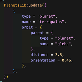 PlanetsLib:update(configs)— Updates the position of a pre-existing space location, as identified by the passedtypeandnamefields. Any other fields passed will be updated on the prototype, and if theorbitfield is passed thedistanceandorientationfields on the prototype will also be updated, along with thedistanceandorientationof its children and grandchildren. Any fields not passed will be left unchanged.