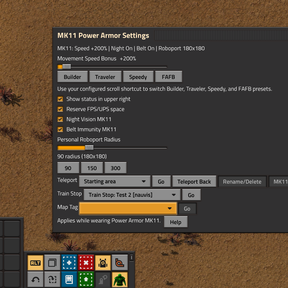 This version also adds a strong mobility and travel layer for large factories. The suit includes quick teleport tools for saved spots, other online players, starting area, train stops, map tags, MK11 Ping, and instant map-click teleporting, all from inside the MK11 Power Armor Settings panel.
