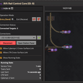 自 v0.12 起重新原生支持 Cybersyn 2。通过 CS2 的 route plugin 接口实现跨地表调度,系统会综合入口距离与出口到目标站距离,自动选择全局最优传送路径。
