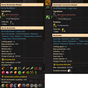 Adds a biochamber that uses standard chemical fuels instead of nutrients. This makes usage outside of Gleba less complex while still requiring more effort than basic chemical plants. The burner variant unlocks at the same time as the normal biochamber.