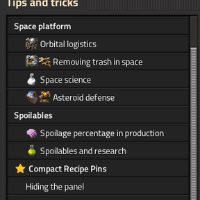 Remind yourself about anything in Factorio with a single key. Inspect the pins and explore their recipes, so you won't forget what you need.
