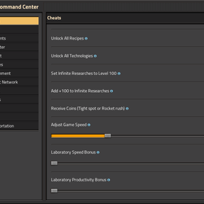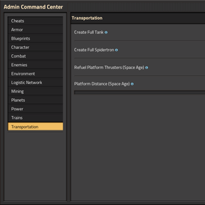 Cheat Toolscrafting tab (startup setting) with recipes for:infinity-chest,infinity-pipe,heat-interface,electric-energy-interface,loader/fast-loader/express-loader/turbo-loader(when available),linked-chest,lane-splitter,infinity-cargo-wagon,burner-generator.