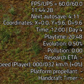 Ctrl + Shift + Tby default). - ๐ Stats HUD (coordinates, time/day, playtime, evolution, pollution, research ETA, movement/vehicle speed, fuel, handcraft timer).