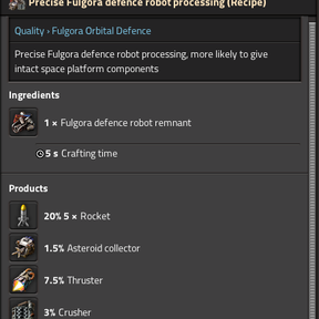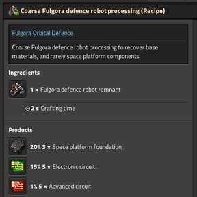 Ancient defence robots have been sitting in an orbit around Fulgora undisturbed for eons until your approach. Attack their hibernation pods and the robots will retaliate. Harvest their destroyed remnants to repurpose any salvaged material into your own space platforms.