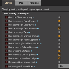 - Remove military science packs: Removes the military science pack from all technologies and hides the science pack.