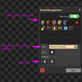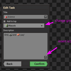 - Tasks - Create, delete, reorder, insert icons, and move tasks between groups.
