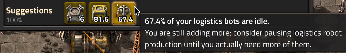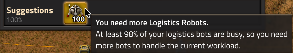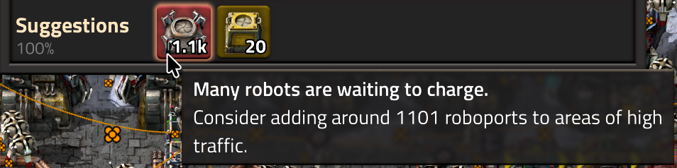 - If too many bots are "waiting to charge", you'll get a "Build more Roboports" suggestion. In the screenshot, 6,300 bots are waiting to charge, so it's quite urgent!