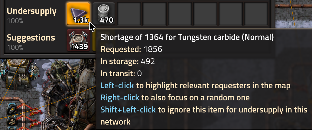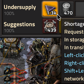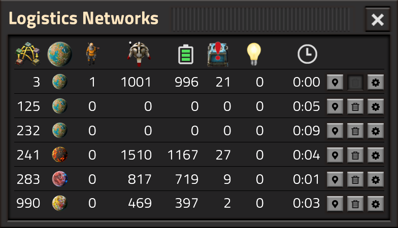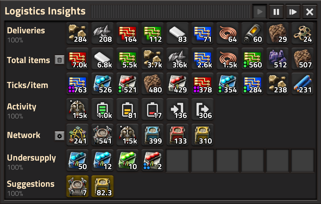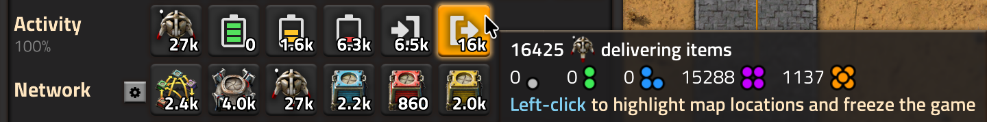 - The logistics bot shows how many logistics bots are idle in your current network. If this gets to 0, you most likely don't have enough. Click this button to open the Logistics Insights window to see much more detail about the network.