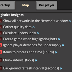 What Logistics Insights does takes time, and for very large bot networks can cause the game to slow down. The mod is written to mitigate this by processing the bots, network items, etc. in chunks, so it only processes a small portion of the whole each tick. The default chunk size is 400, but you can change this.