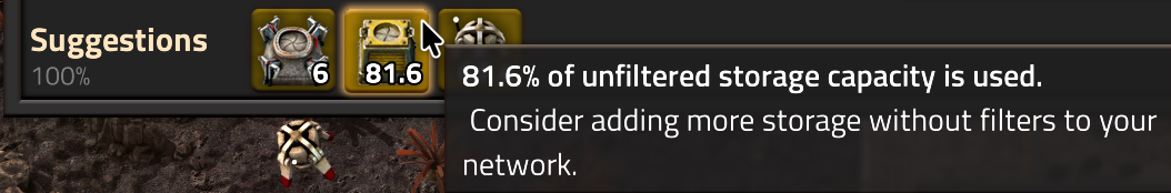 - Build more storage. If your storage is close to full, your network will work less efficiently as bots need to go further to find available storage. This suggestion shows up when your storage is 70% full, and becomes High priority when it's 90% full. Note that "fullness" of storage is measured by stacks, so you may have more storage available than LI suggests as it only looks for empty stacks.