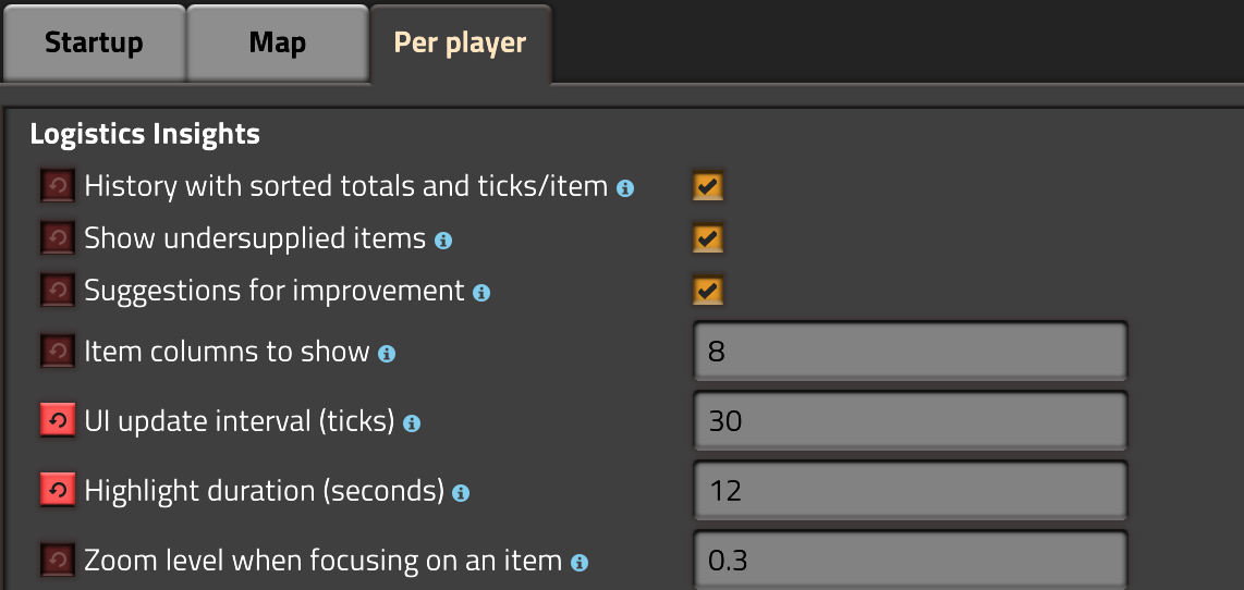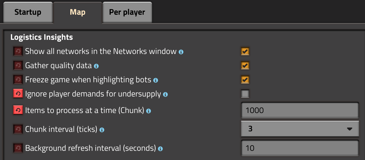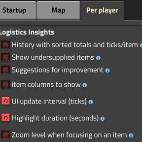 Logistics Insights has several settings that are on a per-map basis. These allow you to control what data is gathered and whether you allow freezing the game; since all data gathered is global to all players, these are configured for everyone: