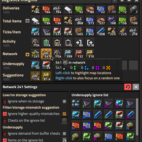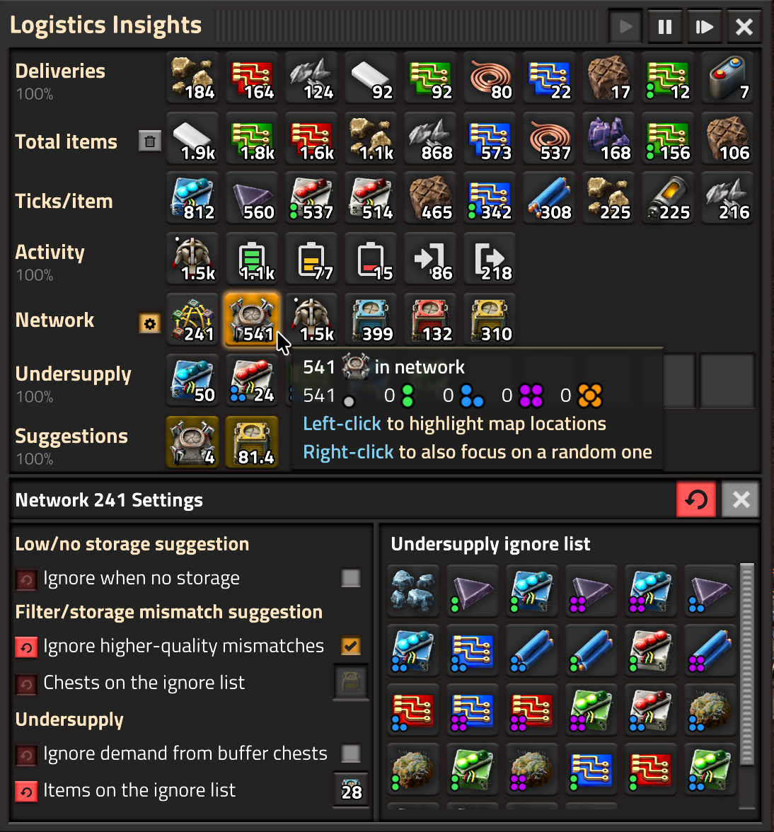 Before a base reaches megabase level, keep the Networks window open to keep an eye on whether there are a lot of things in Undersupply or Suggestions. Then, if there is an issue, click on the network to immediately move the map view there and see the main Insights window: