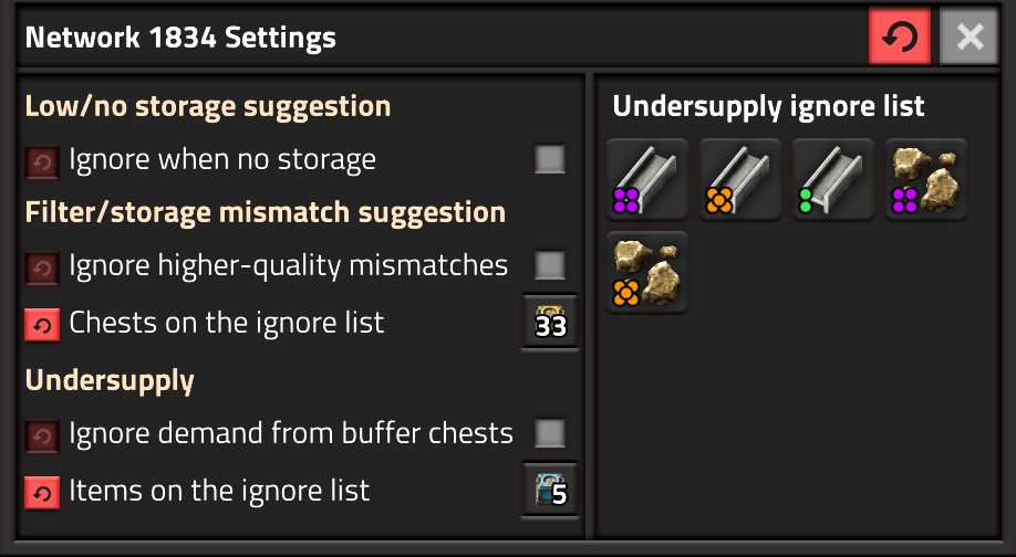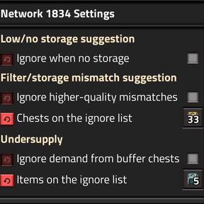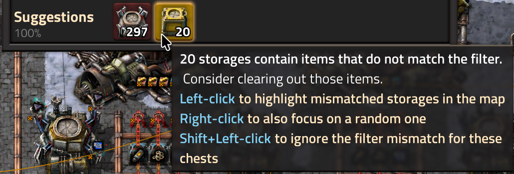 - Filtered storage mismatch. If your filtered storage has items that don't match the filter, LI suggests you fix it. You can click/right-click on the suggestion to see which chests show the problem, which is otherwise hard to find. If a mismatch doesn't matter to you, you can Shift-click on the cell to ignore the chests in question from flagging a mismatch.