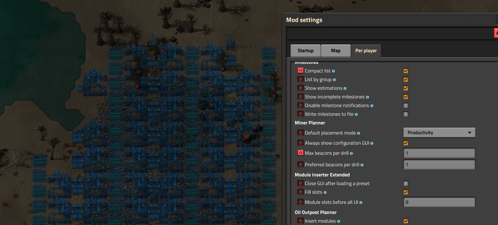 Miner Planner automates mining drill placement on ore patches. Drag-select an area, pick your drill, belts, poles, and beacons from an icon-based GUI, and ghost entities are placed in optimized paired-row layouts ready for construction bots. Works with all drill types, belt tiers, pole types, and resources across all planets.