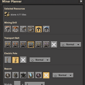 Miner Planner automates mining drill placement on ore patches. Drag-select an area, pick your drill, belts, poles, and beacons from an icon-based GUI, and ghost entities are placed in optimized paired-row layouts ready for construction bots. Works with all drill types, belt tiers, pole types, and resources across all planets.