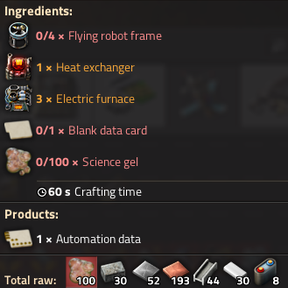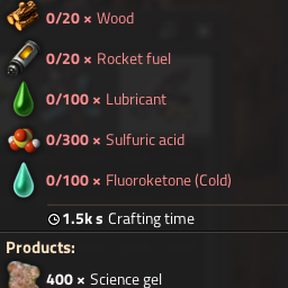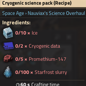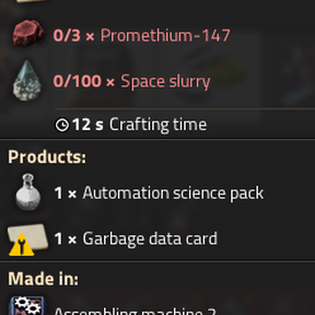 Each planet has a gel recipe and a data recipe, which overall require the player to automate more resources than the base game requires. Nauvis requires uranium, and Vulcanus requires lots of concrete, as an example. Data must be shipped to platforms via MANY more rockets than you would normally need in a vanilla game, and those platforms must convert the data to packs via a third recipe chain that takes trace amounts of promethium gathered during the trips between each planet. A new optional upcycling method allows obtaining higher quality science, but requires more platform infrastructure to accomplish.