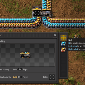 A simple mod which adds a "null" item/entity. It is intended for use in splitter filters to stop items from traveling onto an unused path, or in blueprints to mark areas which should be empty.