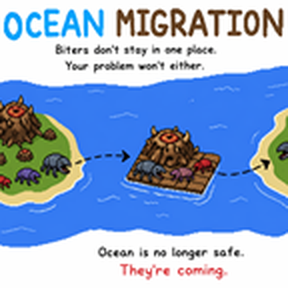 Ocean Migration lets biters cross deep oceans and rebuild nests on distant land once evolution is high enough. They earn migration budget over time, scaled by evolution and the budget scaling setting. Tune frequency, costs, cooldowns, nest count, and optional experimental island-building.