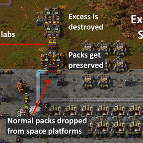 I've provided an example setup in the first image but the general idea is you preserve all the science dropped to nauvis and simply destroy any excess. This way your ships and science production on the planet where you make the packs never needs to stop.