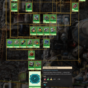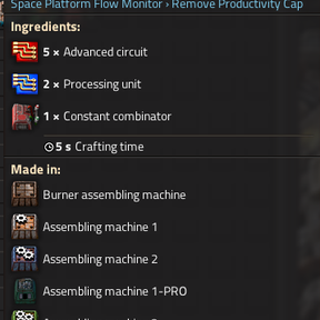 Reads data from all your space platforms and outputs it to the circuit network via virtual signals. Place a monitor on each platform and manage your entire fleet from the planet surface.