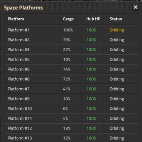 Opens via a toolbar button when on a planet surface. Shows a table of all platforms with their names, cargo fill %, hub HP % and status (Orbiting / In transit / ⚠ CRITICAL).