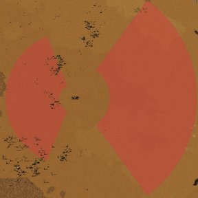 Range: 10 to 50 tiles, cone-shape (like flamethrower turret). Could change to 360 full range in startup setting