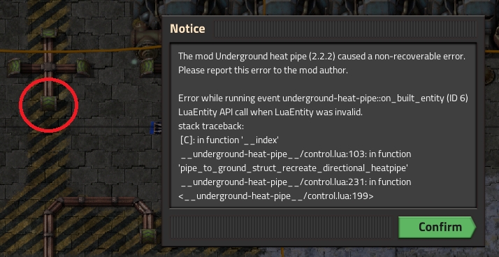 The above image holds the crash log, as well as the situation which caused it. I placed the Heat Pipe under the red circle, then the crash happened. I had been placing and replacing Underground Heat Pipes for some time, trying to clean up a design. Some may have been forcibly replaced via in-game copy/paste. There used to be an Underground Heat Pipe below, where the Heat Pipe corner intersection is in the screenshot, but I removed that shortly before.