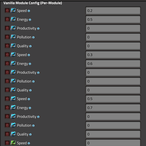 Fine-tune exact effect values (speed, energy, productivity, pollution, quality) for every tier* of Speed, Efficiency, Productivity, and Quality modules.